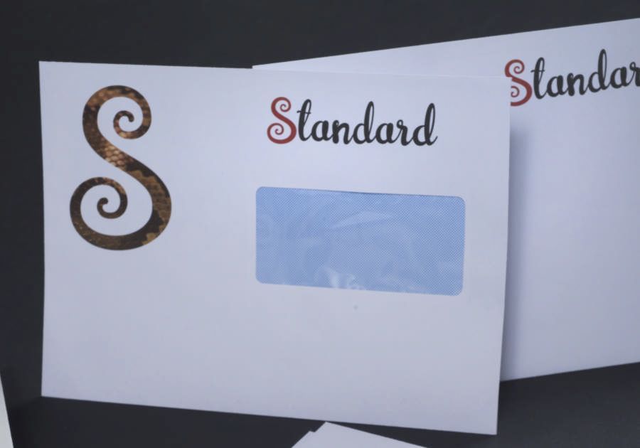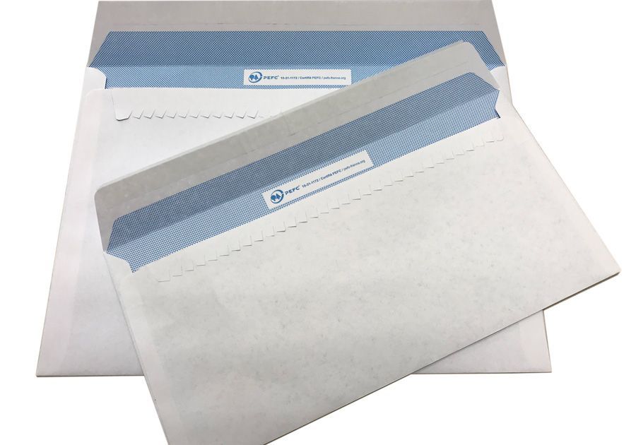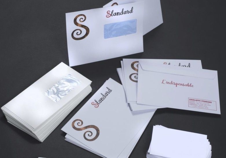 Les enveloppes standards sont en 90g.m², 100g.m² ou 120g.m² en papier blanc, sans fenêtre ou avec fenêtre 45x100mm, en formats standards, fermeture adhésive avec bande de protection sauf pour l'enveloppe 9x14cm, impression recto uniquement