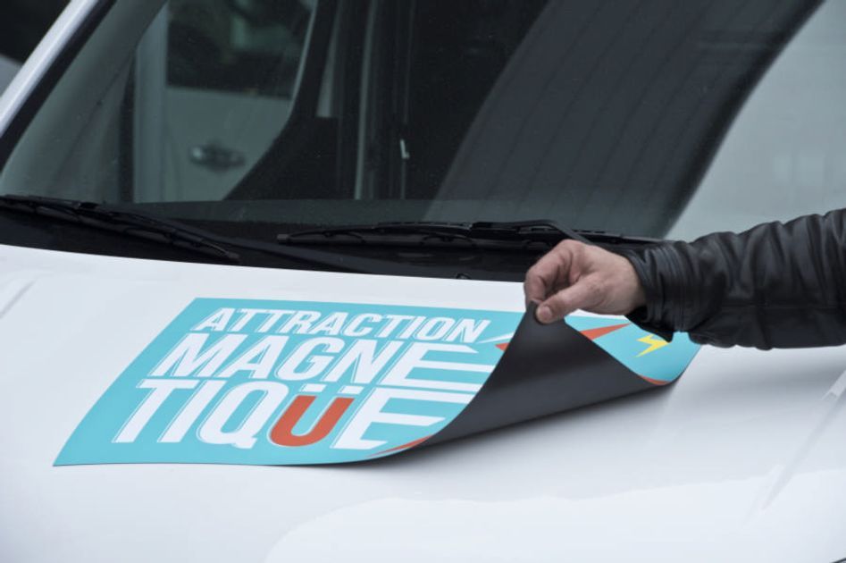 La plaque magnétique à une face imprimée et un revêtement magnétique noir au verso. Son épaisseur est de 850µm et sa force magnétique est de 35 gr/cm2 ; elle se positionne ou s'enlève sur les supports métalliques, elle est compatible sur véhicules.