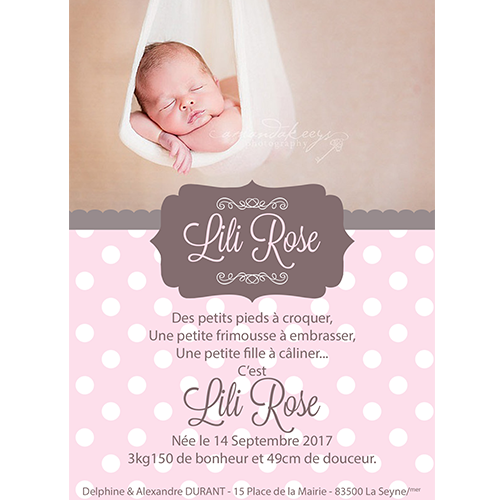 Les faire-part naissance sont personnalisés sur le thème que vous souhaitez avec ou sans photos ; ils sont imprimés à partir de vos fichiers ou de notre création.