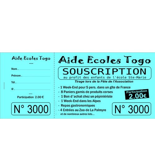 billet/ticket de tombola/souscription agrafés en carnets de 10ex, 25ex, 50ex ou 100ex impression noire avec numérotation
